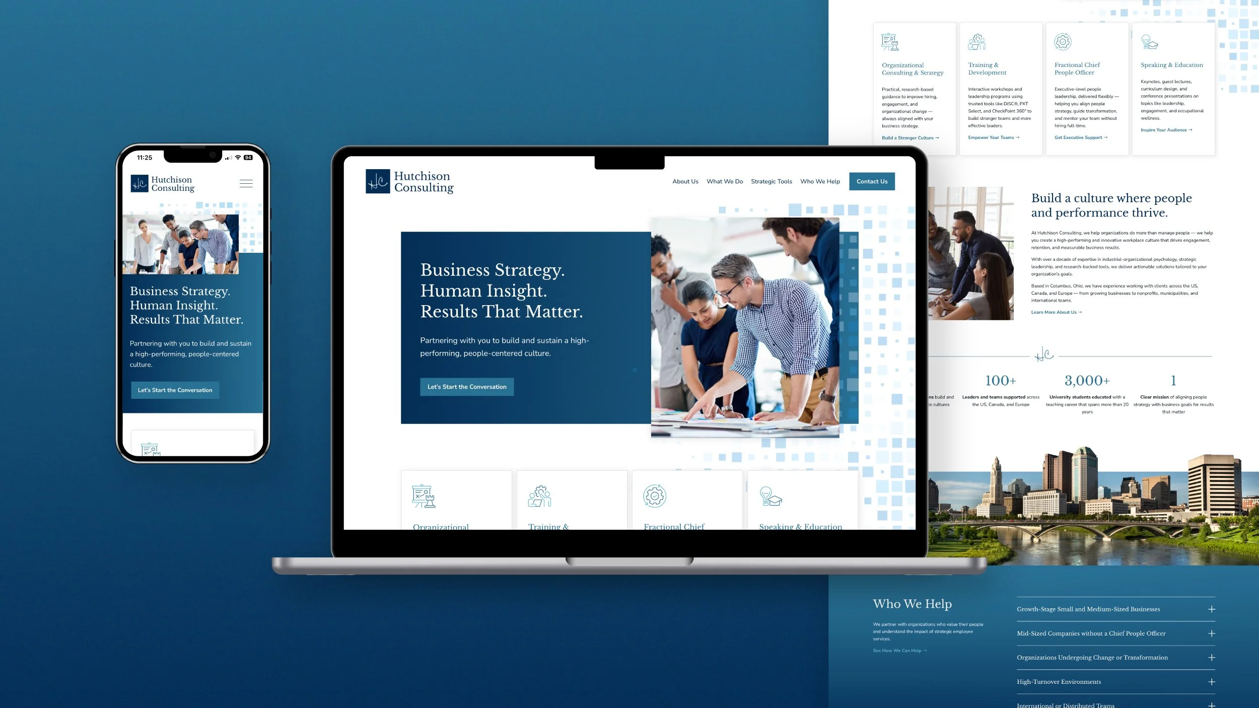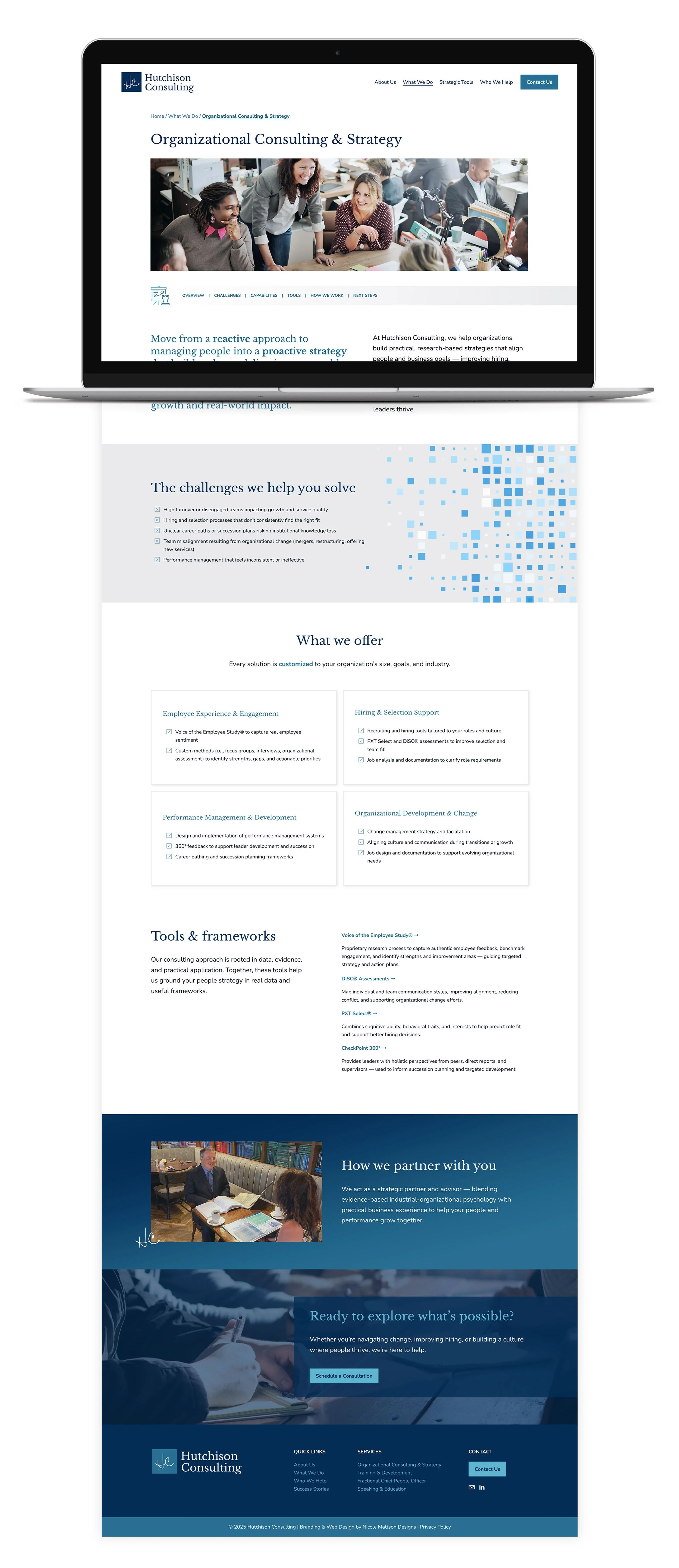 This project brought together branding, web design, and UX strategy into a cohesive transformation for Hutchison Consulting. By combining research-driven information architecture with a modern, professional visual identity, we delivered a site that is clear, scalable, and deeply aligned with Hutchison’s mission of creating high-performance cultures.